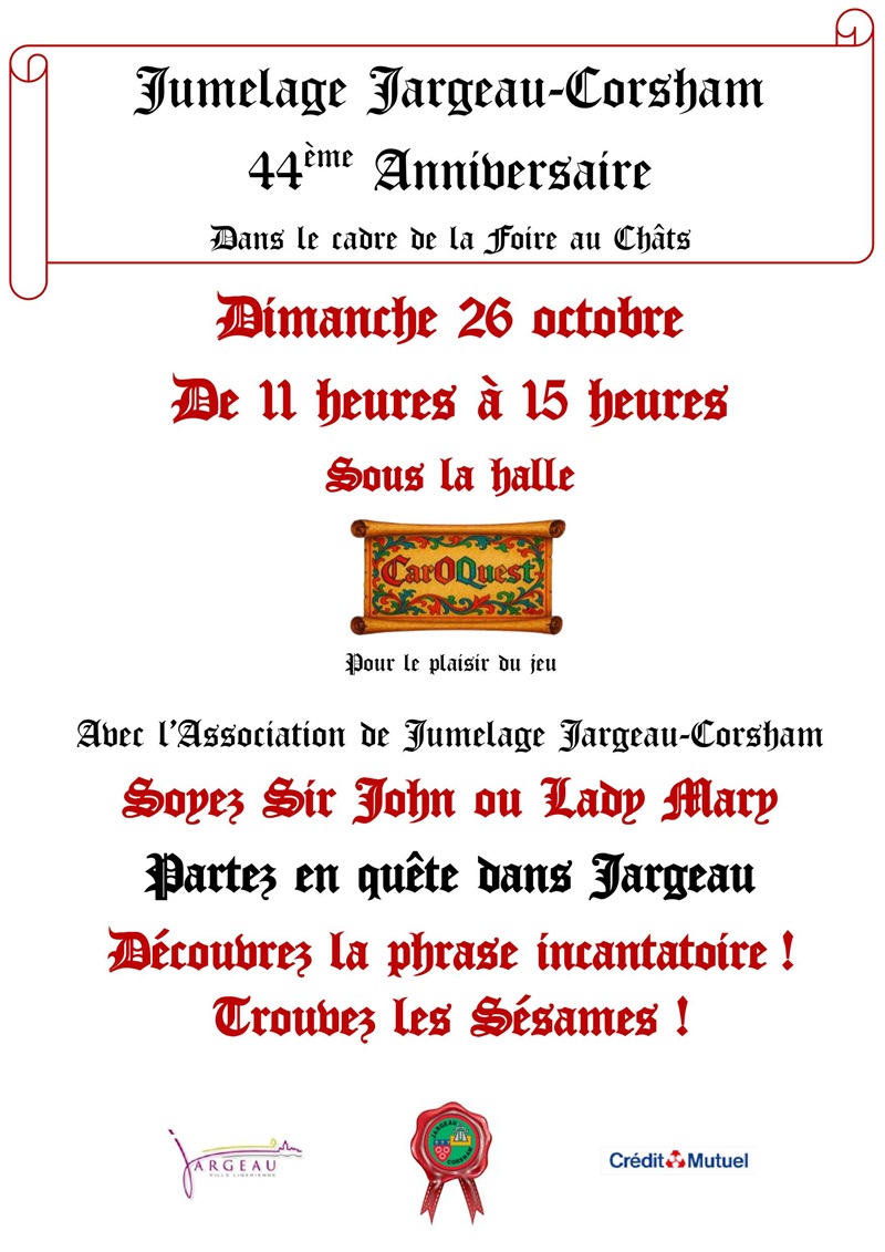Chasse au Graal proposée par l'association de jumelage de Jargeau-Corsham. Pour le plaisir du jeu : soyez Sir John ou Lady Mary et partez en quête dans Jargeau pour retrouver la phrase incantatoire. Trouvez les sésames. Durée en 30 mn et 1 heure. Pas d'heure fixe pour le départ