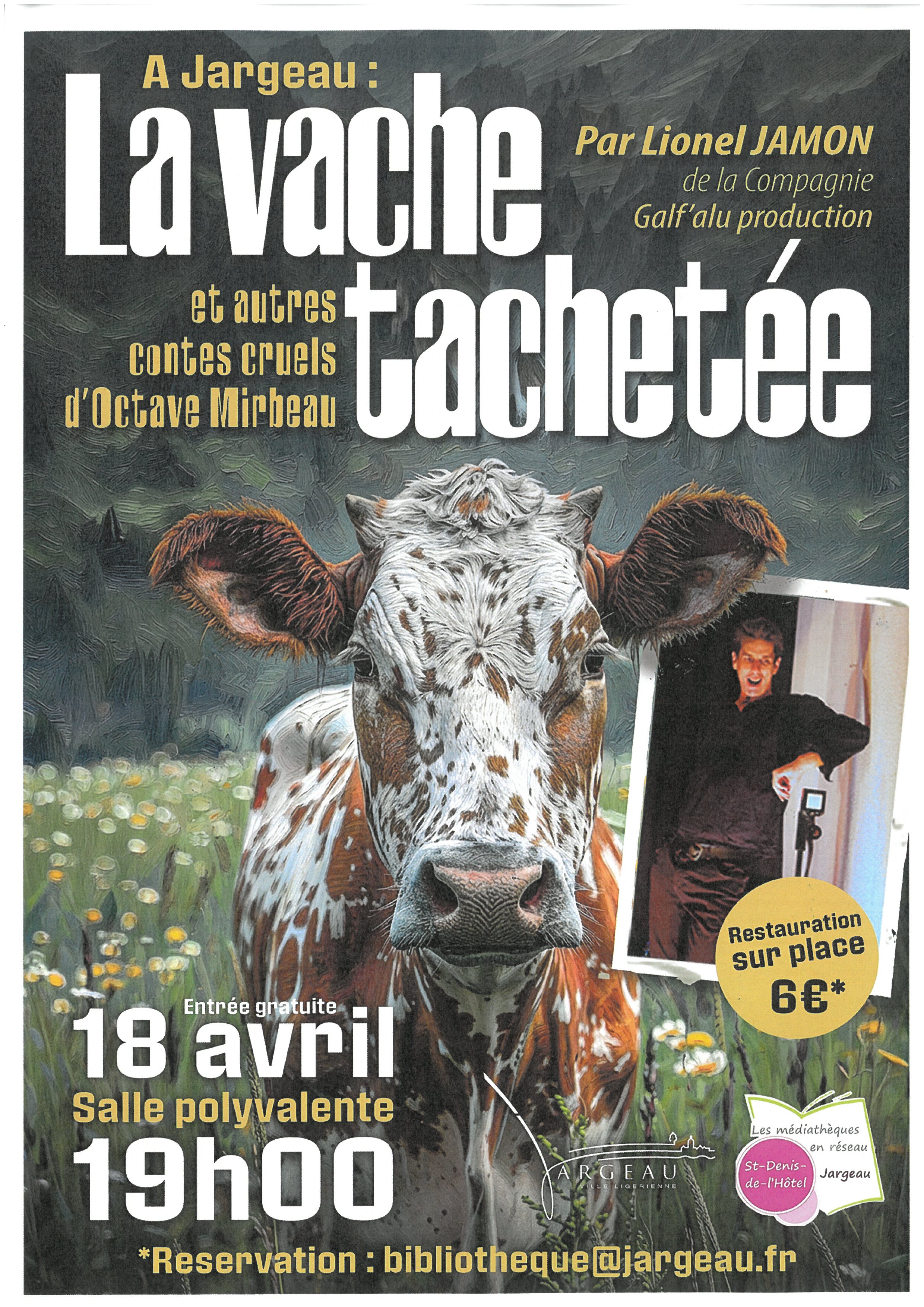 Plongez dans un univers aussi fascinant que dérangeant avec "La vache tachetée et autres contes cruels" d’Octave Mirbeau interprété par le comédien Lionel Jamon (Compagnie Galf'Alu). Une expérience intense, entre ironie, absurdité et noirceur… Imaginez un homme enfermé, seul face à ses pensées, cherchant désespérément la faute qu’il aurait pu commettre… jusqu’à douter de ses propres actes de bonté. Un texte troublant, puissant, qui questionne notre rapport à la justice et à la morale. À partir de 15 ans. Sur place, une planche apéro à partir de 6€ et 8€ avec une boisson en partenariat avec la Laiterie Gilbert de Jargeau. Réservation obligatoire pour la restauration : bibliotheque@jargeau.fr