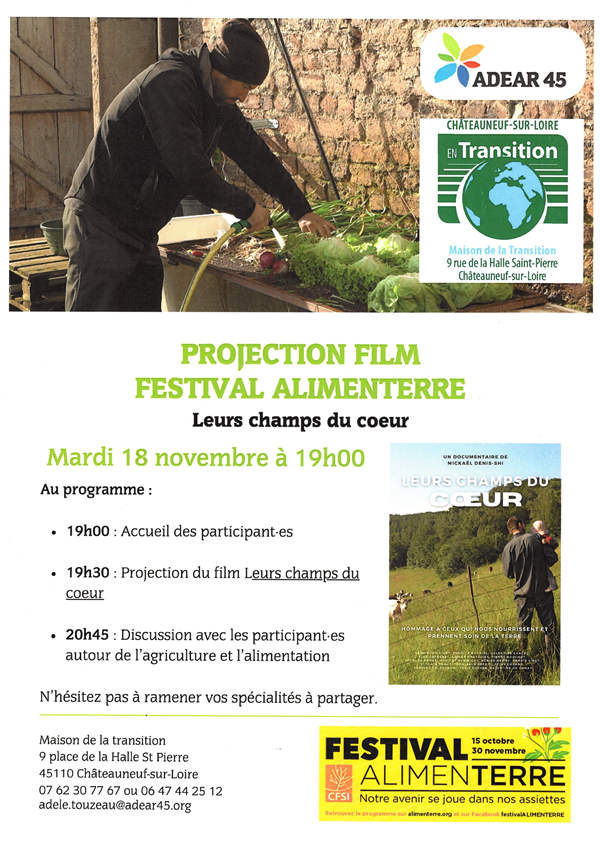 Soirée projection dans le cadre du festival alimenterre. RDV à 19h, projection à 19h30, repas partagé. Film "leurs champs du coeur".