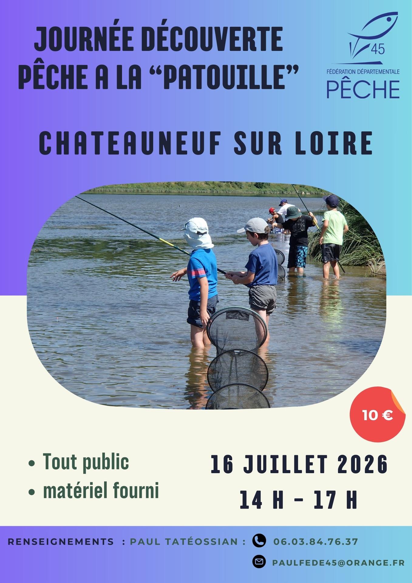 Après-midi (de 14h à 17h) d'initiation pêche "à la patouille", pêche au coup les pieds dans l'eau. L'animation se déroule sur les bords de Loire, sous le pont de Châteauneuf-sur-Loire. Accès via le chemin du camping municipal (camping de la Maltournée). 10 € / personne, matériel fourni.