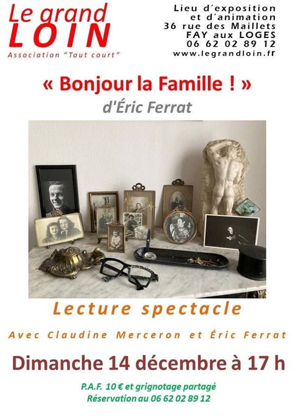 Avec Claudine Merceron et Eric Ferrat. Un peu comme un hymne à la joie, « Bonjour la famille ! » pose un regard rieur et parfois ému sur une famille haute en couleur et un soupçon iconoclaste. Recueil d’anecdotes cocasses où chaque nouvelle ajoute une pierre à l’édifice romanesque. Humour, tendresse et irrévérence joyeuse sont au programme.