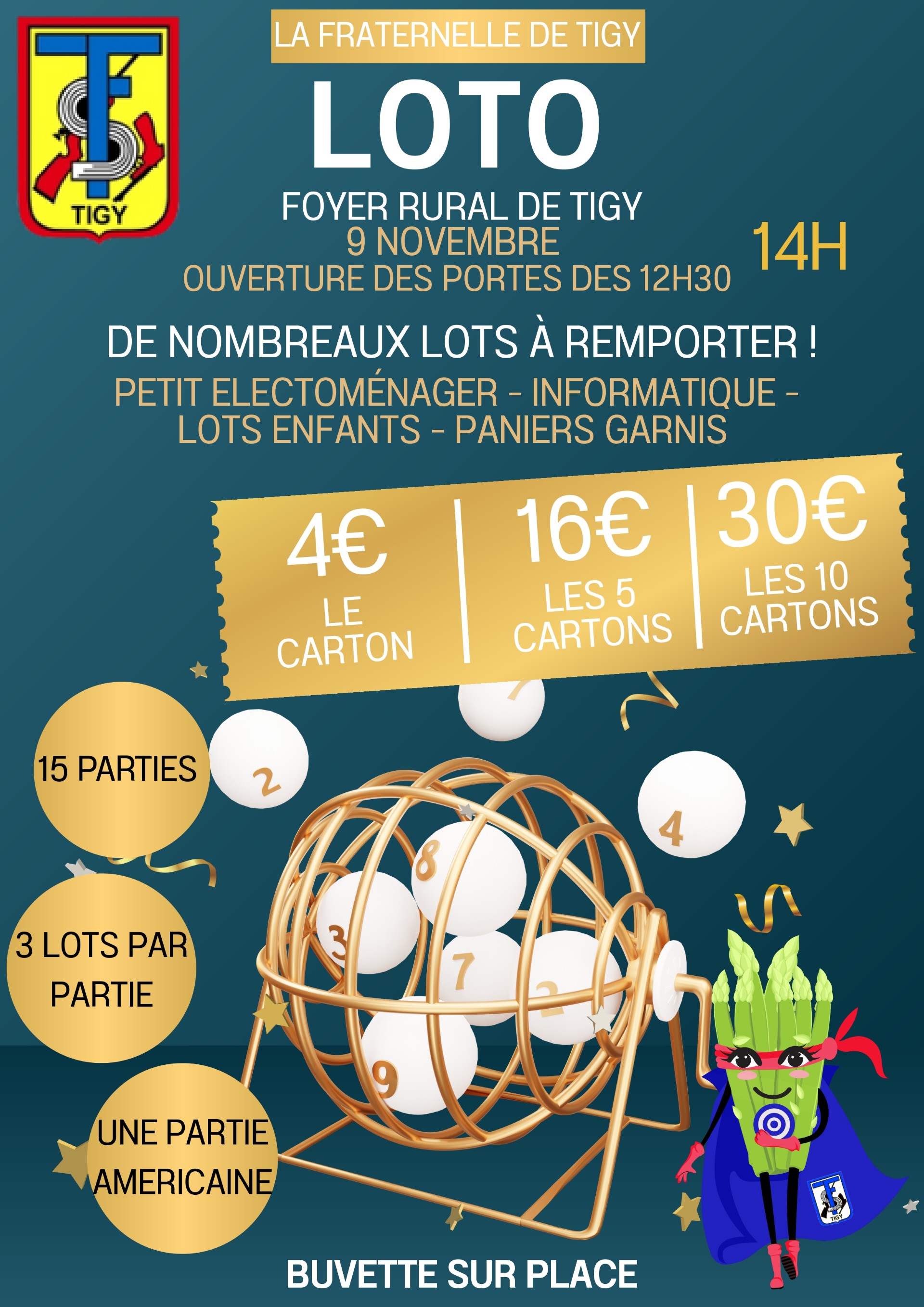 Loto organisé par le club de tir de La Fraternelle de Tigy. 15 parties, 3 lots par partie, 1 partie américaine. Nombreux lots, buvette sur place. Ouverture des portes à 12h30, début des jeux à 14h