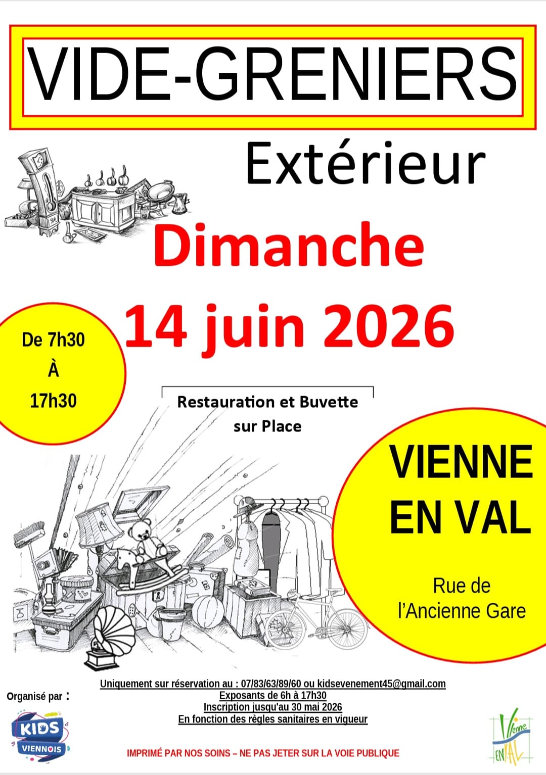 Vide-greniers en extérieur. Inscriptions jusqu'au 30 mai 2026 (8€ les 3m). Entrée gratuite pour les visiteurs. Restauration et buvette sur place.